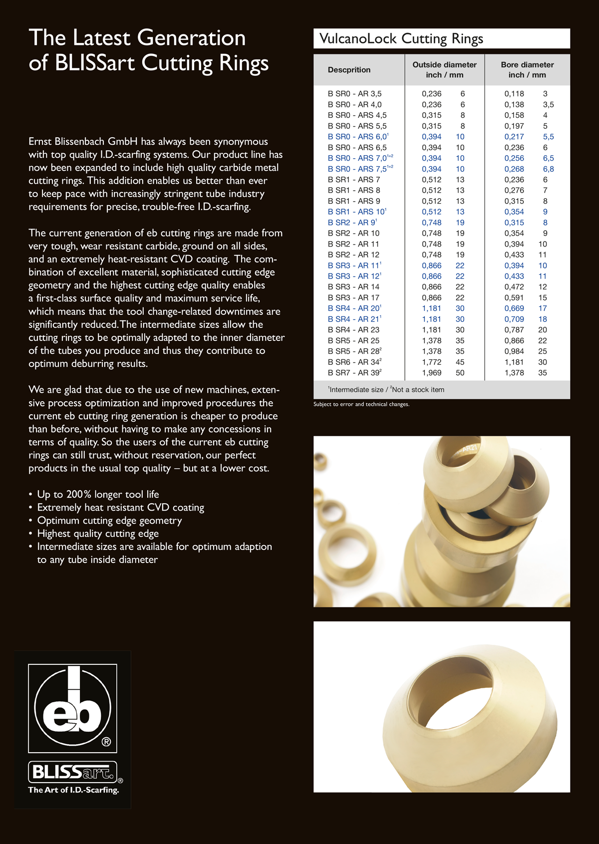 The new Ernst Blissenbach cutting rings are made of extremely tough, wear resistant carbide metal. In addition, these cutting rings feature a 100 % ground surface and an extremely heat resistant CVD coating. The winning combination of material, cutting edge geometry and optimum cutting edge quality delivers superior surface quality and service life. The result: reduced down time. Blissenbach also offers intermediate sizes to ensure a perfect match to your inside tube diameter. For you, this translates into superior deburring quality of your tube production.